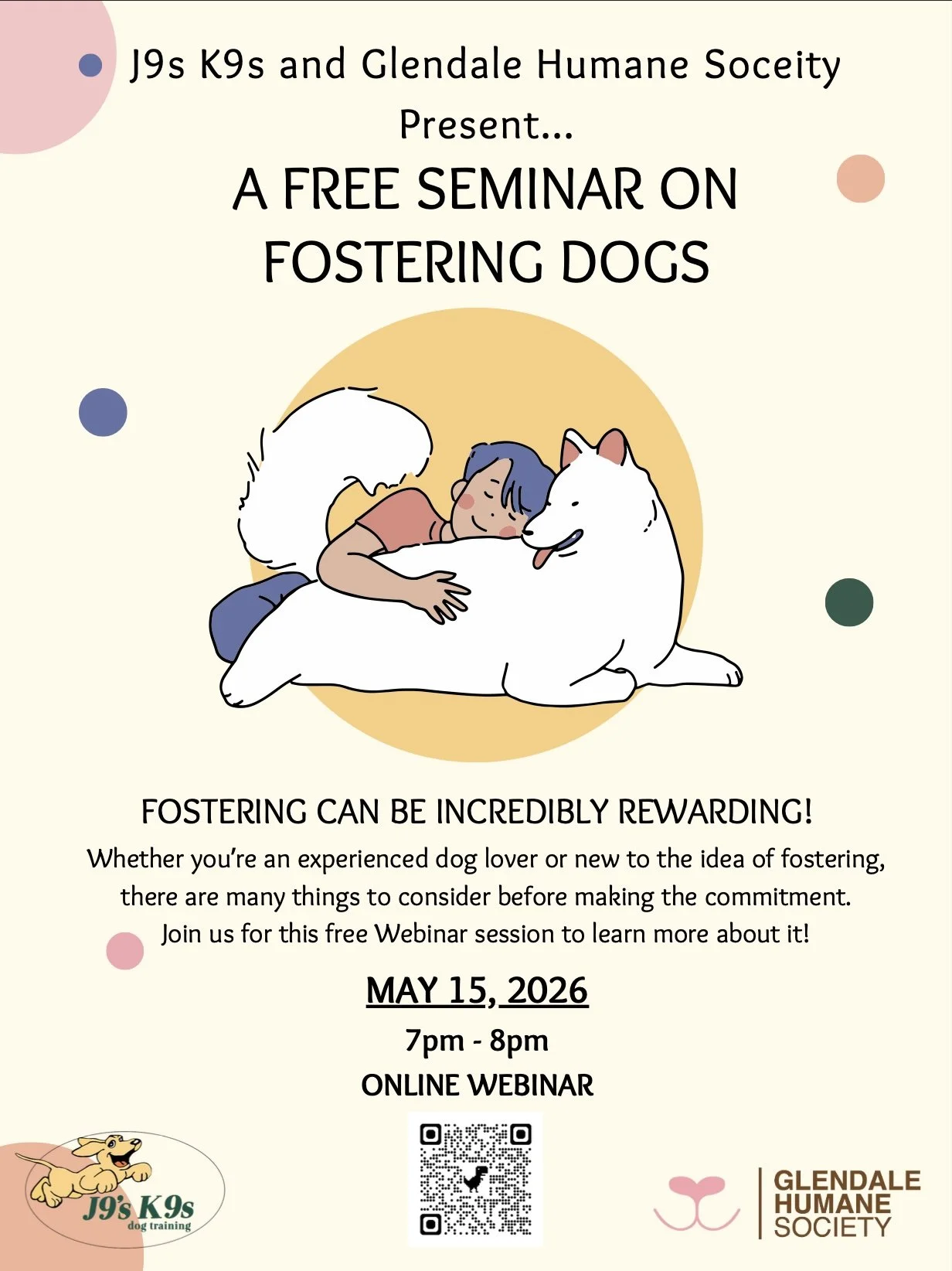 Glendale Humane Society and J9s have teamed up to bring you this interactive and informative session on what it takes to foster a dog.